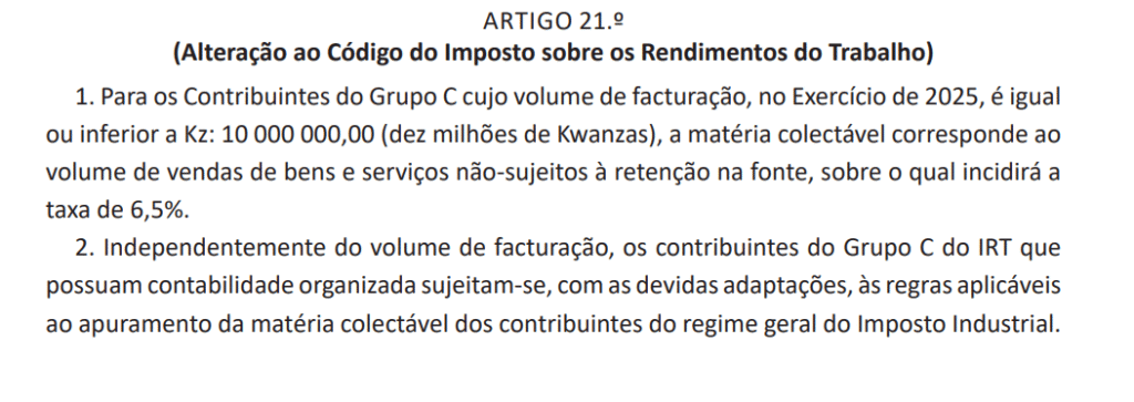 O Imposto sobre os Rendimentos do Trabalho (IRT) é obrigatório para todos os contribuintes em Angola, mas o cálculo varia de acordo com o regime e volume de facturação. Neste artigo, Dr. Mauro Machado explica de forma prática como os contribuintes do Grupo C devem apurar o imposto devido, com base nas regras da Lei do Orçamento Geral do Estado para 2025 (Lei n.º 14/25, Diário da República de 30 de dezembro de 2025).
